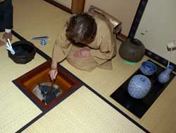 ![]() まず炭をつぐ | ![]() 懐石をいただく | ![]() 濃茶のお点前 |
