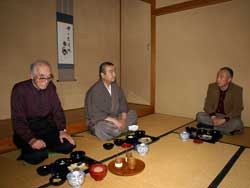 ![]() この掛け物を書いた方も参加 | ![]() 先ずは簡素の道具でお茶一服 | ![]() 右上がふろふき大根です |