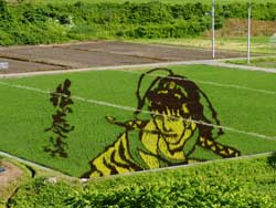 2013年5月26日に地元の小学生やボランティアの方々が参加され、田植えが行われました。昨年から白稲が使われ、話題になりましたが、今年はさらに赤い稲「べにあそび」が使われているそうです。いろいろな稲が使われれば、それだけ緻密な絵が描けます。
