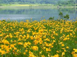 2013年7月2日早朝、喜多方市の萩平駐車場に車を駐め、6時発のシャトルバスで金沢峠まで行きました。その展望台から雄国沼を見渡すと、一面のニッコウキスゲでした。