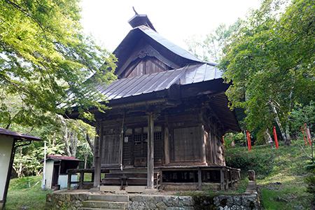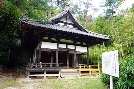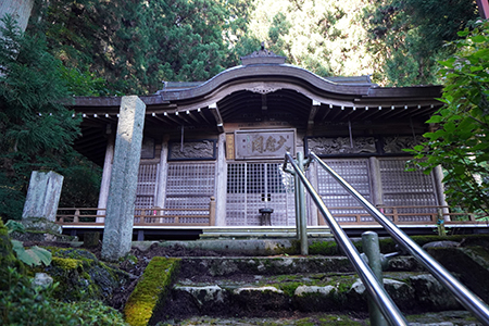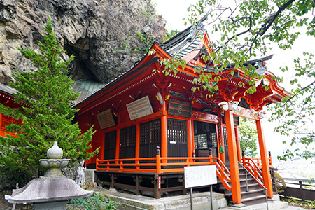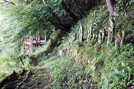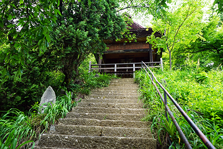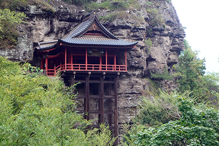 第23番札所の宝蔵寺へは、先ずは県道177号線を300mほど行き、別所温泉の丁字路信号から右折し、県道82号に進みます。11qほど先の丁字路を右折し県道65号に入り、300m先から左折し尾根川を渡ります。そして、依田神社のところから右折し進むと、左側に「岩谷堂観音駐車場」があります。そこに車を駐めて、山手を眺めると大きな岩の下に朱塗りの観音堂が見え、それが通称岩谷堂観音の由来のようです。