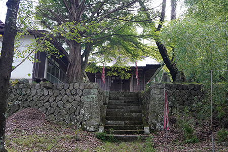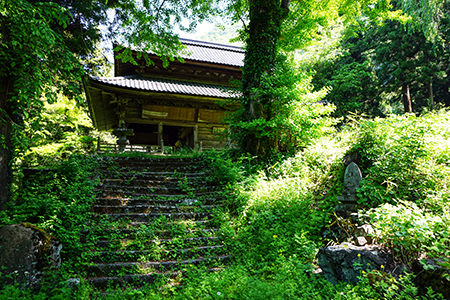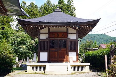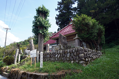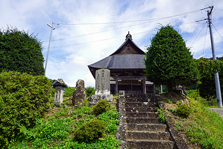 第10番札所「高顕寺」は須坂市仁礼中村にあり、第9番「蓑堂」からは、先ほど走ってきた道をそのまま進み、国道406号の丁字路を右折し、300mほどで左折するとすぐ橋があり、まっすぐのところに石段があり、右側に「真言宗豊山派」と書かれた石塔が立っています。そこを道なりに右折し進むと、左側に石塔と石碑などが立っていて、その間を進むと、ほどなく高顕寺に着きます。