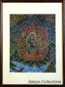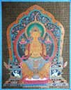 (画像サイズは53.9KB) これは2002年3月14日にタメルで購入したものですが、お店の人は「フューチャー・ブッダ」と呼んでいました。これは今まで収集した曼陀羅と少し違い、一尊だけを描き、その周りも独楽つなぎのような文様で埋められています。画像も相当大きく、持ち帰るのに苦労しました。