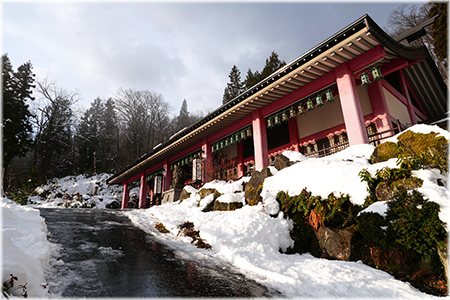 この左の写真は、12月30日の朝に撮った神殿です。この日は、小野川温泉にモヤが掛かり、ぼやっとしていましたが、その後は晴れました。