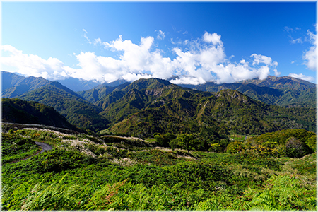この日は、天気もよく、青空でしたが、山頂付近は雲がかかり、すっきりとは見えませんでした。それでも、叶水からの樽口峠への道は、長い間通行止めになっていたので、やっと開通したと聞き、ここを通ってみたいというのもここへ上った理由のひとつです。