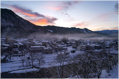 この日は、寒さで早く起きてしまったのですが、窓を開けると朝焼けが見え、外に出ると霧もかかっていました。小野川温泉の街灯もまだ点いていて、いかにもまだ明け切らない雰囲気でした。遠くには、西吾妻山もはっきりと見え、天元台高原スキー場もよくわかります。