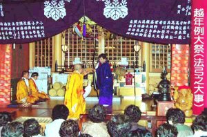 写真は、大祭当日に行われる山伏による作法の一種で、「法弓の大事」といわれています。これは、弓矢を使い、四方八方をすべて払い清め、悪魔がいないことをもう一度確認するものです。