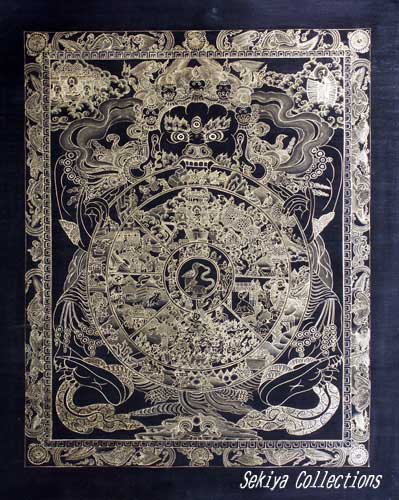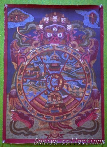 (画像サイズは52.3KB) これは2004年4月にカトマンドゥで購入した「六道輪廻の図」です。これとほぼ同じ曼荼羅は4点ほどありますが、これがもっとも精細に描かれています。もともと曼荼羅に興味を持ち始めたきっかけは、ブータンのお寺の壁に描かれた「六道輪廻の図」を見たことでした。それから20点以上は見ていると思います。