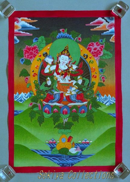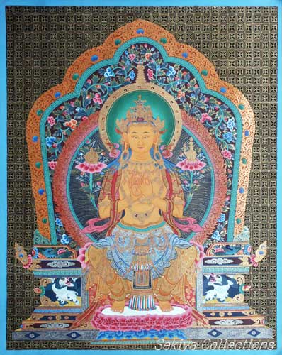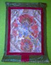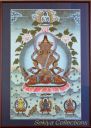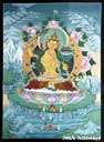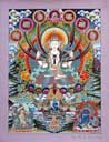 (画像サイズは53.9KB) これは2002年3月14日にタメルで購入したものですが、お店の人は「フューチャー・ブッダ」と呼んでいました。これは今まで収集した曼陀羅と少し違い、一尊だけを描き、その周りも独楽つなぎのような文様で埋められています。画像も相当大きく、持ち帰るのに苦労しました。