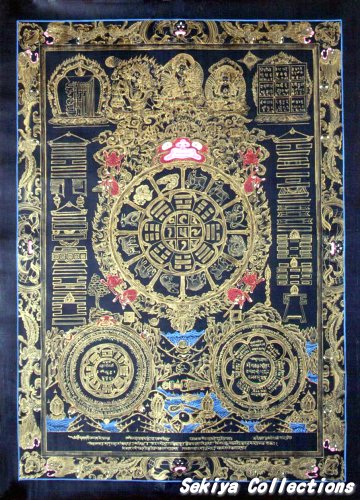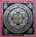 (画像サイズは57.3KB) これは2002年3月11日にネパールカトマンドゥ市内のタメルで購入したものです。これもカーラチャクラの一種ではないかと思いますが、黒地に主に金とブルーを用い、とても細かく描いています。