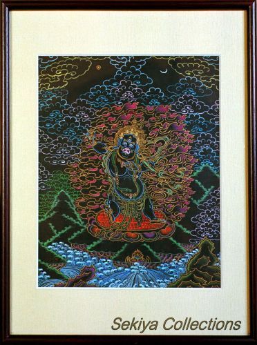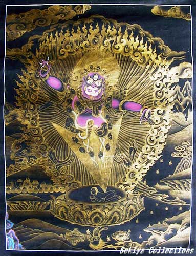 (画像サイズは46.4KB) これは1999年5月にネパールのメル友であるビノットさんに依頼して購入した大黒天(マハキャーラ)のマンダラです。非常に丁寧に描かれており、チベットの最も一般的な大黒天の姿をしています。ですから、お寺に描かれている大黒天も、このお姿が多いようです。