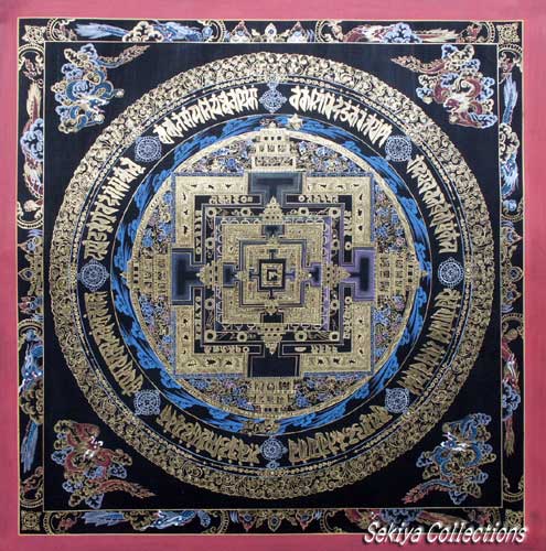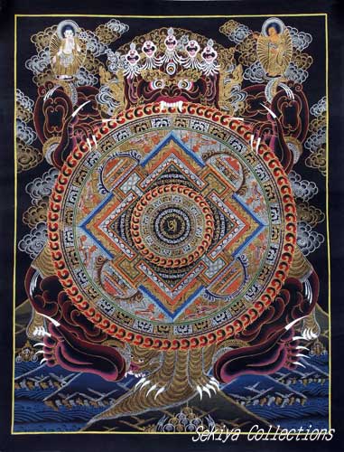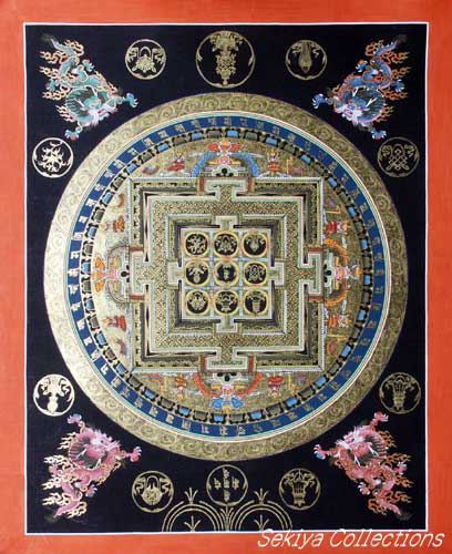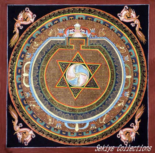 (画像サイズは48.9KB) これは2002年3月14日にネパールカトマンドゥ市内のタメルで購入したものです。これもカーラチャクラの一種だと思いますが、画面も大きく、内部も丁寧に描かれ、四方の龍も繊細で、全体に本金を使っていると思われます。