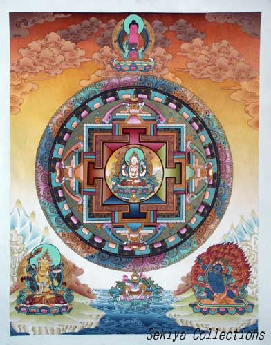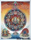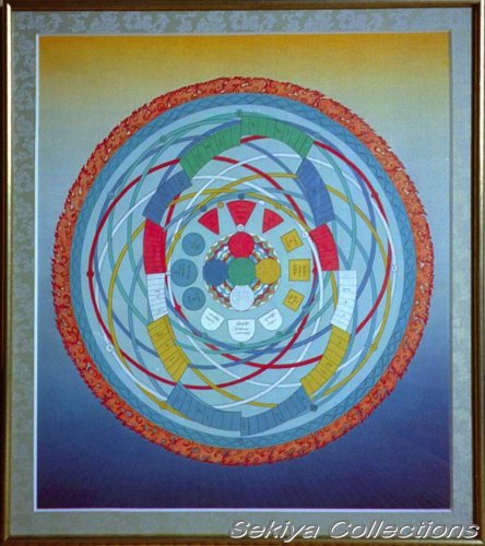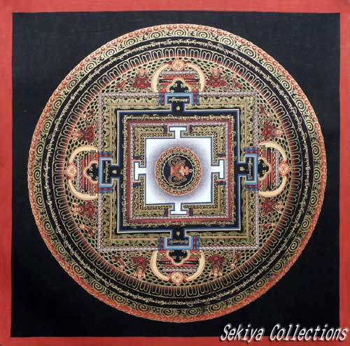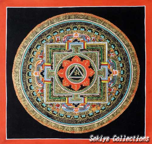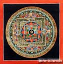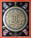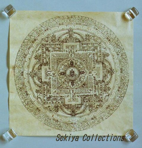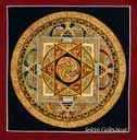 (画像サイズは62.9KB) これは2000年3月にネパールに行ったときに購入したマンダラです。場所はカトマンズのダルバール広場の一角のお店ですが、前日(4月8〜9日)にお釈迦さまのお生まれになったルンビニーに行った記念として求めたものです。