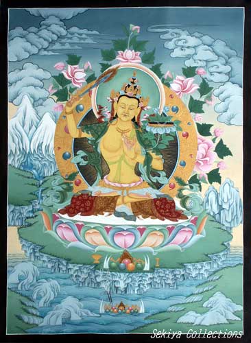 (画像サイズは40.3KB) これは2004年4月にネパールのカトマンドゥでもとめた観音さまのマンダラです。ぼかしも丁寧で、細部にこだわって画かれたもので、一目で気に入ったものです。もちろん、値段の交渉にはだいぶ時間がかかりましたが、今でもときどき出しては引っ込めて眺めています。