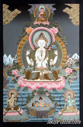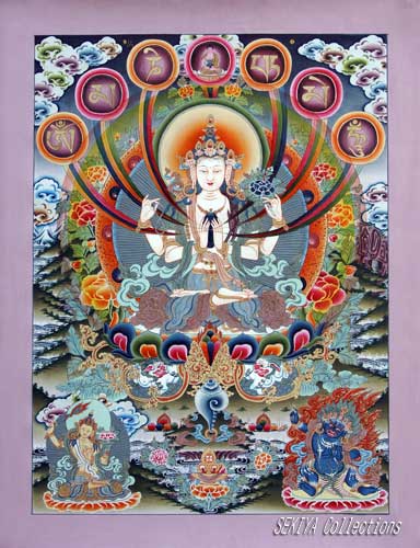 (画像サイズは52.6KB) これは2004年4月、ネパールのカトマンドゥでもとめた千手観音さまの正方形マンダラです。形はカーラチャクラのような形式をとっていますが、中央部にはしっかりと千手観音さまが描かれ、その周りにはヒマラヤの雪山が取り囲み、さらにNo.39のような縁起物も細やかに描写されているのが印象的です。