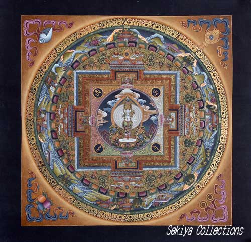 (画像サイズは45.7KB) これは2007年3月30日にカトマンドゥのタメルで購入した観音マンダラです。ちょうど今回の更新で50回目ということで、特に丁寧に描き込んでるマンダラを選びました。この写真ではなかなかわかりにくいのですが、実物は相当大きくて、迫力があります。しかも本金で描き、ぼかしの技法も多用しています。なかなかの逸品です。