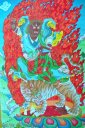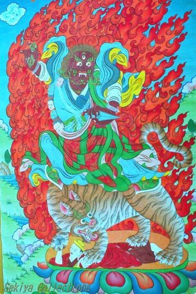 伝えられており、その一つの姿が虎に乗って仏教の敵と戦う猛々しい姿なのです。それを描いたのがこれで、