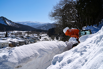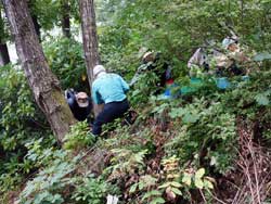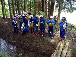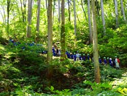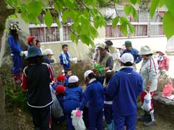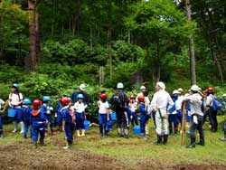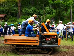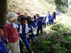 ![]() 学校林へ行く子どもたち | ![]() 児童と運搬車 |