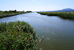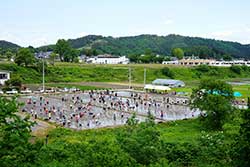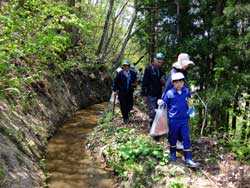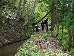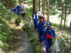![]() 三東小の子どもたち | ![]() 水路のわきを歩く |