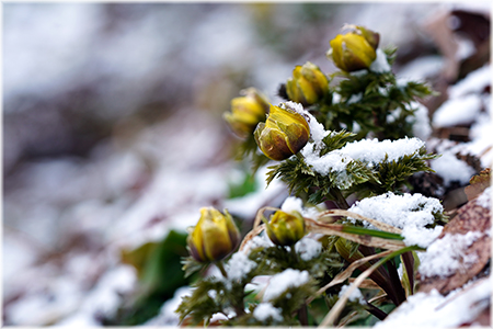 前日の夜から雪が降り始め、朝、目が覚めて外を見ると、うっすらと雪が積もっていました。そこで、朝食前に小町山自然遊歩道に行くと、フクジュソウ群落のところにも雪があり、すぐに写真を撮りました。ところが朝日が射すと、すぐに花の上の雪は消えてなくなり、水滴ばかりが残りました。