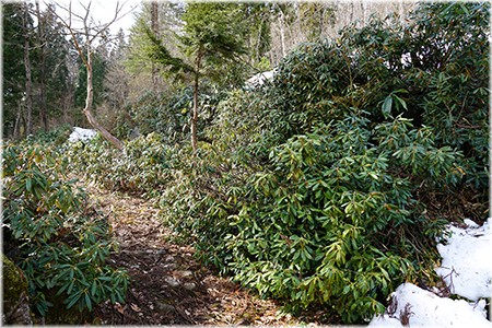 この辺りのシャクナゲは、ほとんどがアズマシャクナゲです。ほとんど雪は消えましたが、ここから50mほど進むと、まだ雪があり、長靴でもぬかるため、輪かんじきが必要です。しかも、ところどころ空洞になっているところもあり、知らずに進むと、膝かぶまでぬかりケガをすることもあります。