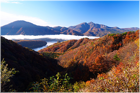☆右の写真は、11月6日の朝に秋元湖展望所から磐梯山と秋元湖などの紅葉を撮ったものです。