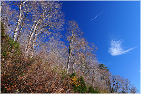 紅葉が始まり、樹々の葉が落ちてくると、いかにシャクナゲが多いのか一目瞭然となります。青い葉のほとんどが、シャクナゲです。