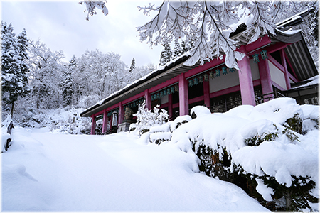 ☆この左の写真は、12月13日の早朝に撮った神殿です。これから除雪をしますが、大雪の場合は右側の階段から上って参拝しますので、案内板の指示にしたがって進んでください。
